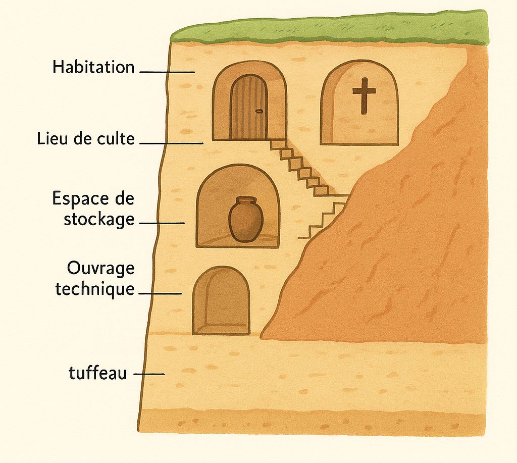 Au fil des siècles, ces espaces creusés ont été adaptés aux besoins et aux savoir-faire des populations locales. Leur architecture troglodytique reflète une parfaite adéquation entre l’environnement géologique et les usages humains : épaisseur des parois pour isoler, orientation des ouvertures pour optimiser la lumière, et organisation interne pensée pour les activités domestiques, agricoles ou artisanales. Cette relation intime entre l’homme et la roche fait du troglodytisme un patrimoine à la fois fonctionnel, esthétique et identitaire.